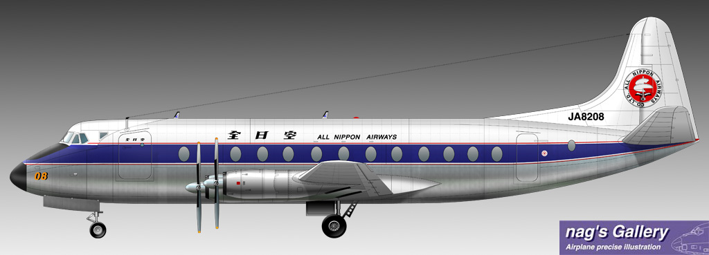 イギリスでは第2次大戦後の民間航空時代を予想し、特にアメリカの旅客機に対抗できうる将来の旅客機を開発するべく、専門家によるブラバソン委員会を設置して様々な旅客機の仕様の検討をはじめた。バイカウントはこの委員会で発案された中型機案で、設計はVickers社が担当した。当時ロールスロイスが初めて実用化した傑作ターボプロップエンジン「ダート」を4基搭載して、1948年7月に初飛行し、VISCOUNT(子爵)と名づけられた。レシプロ機のような振動がないので乗り心地も良く、また視界良好な大型の楕円形窓が乗客に好評であった。 全日空では1960年、52席のバイカウント744を2機チャーター導入し、東京〜札幌線、東京〜大阪線、に就航させ、更に1961年に68席のバイカウント828を導入し、最終的には9機の828を導入し、ジェット化とともにローカル線で運用され1970年に退役した。 |